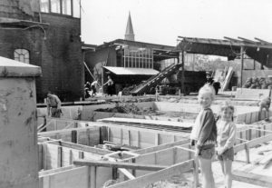 De bouw van de winkel in 1970. Ik sta samen met mijn zusje Yvonne te kijken.